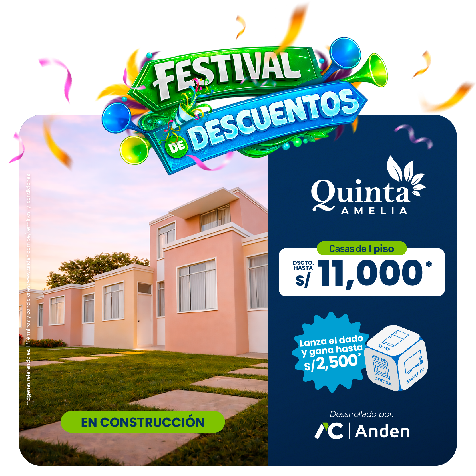 Imágenes referenciales sujetas a variación. La evaluación y el otorgamiento del crédito y demás condiciones, corresponderán a la Entidad Financiera que se elija al momento de la compra. Cuota mensual estimada y referencial para la compra mediante crédito hipotecario bancario de una casa de 1 piso de 43 m2 construido en Terreno de 90m2 aprox en el Proyecto Quinta Amelia. La cuota ha sido calculada mediante un crédito hipotecario, con un 20% de inicial, una tasa referencial (TEA) de 9.85% y un plazo de 20 años y con un bono otorgado por el Fondo Mi Vivienda de S/20,500 (Bono de Buen Pagador) y con el Bono Verde por ser una vivienda sostenible de S/5,988, la TEA considerada en el cálculo es de 9.85%.